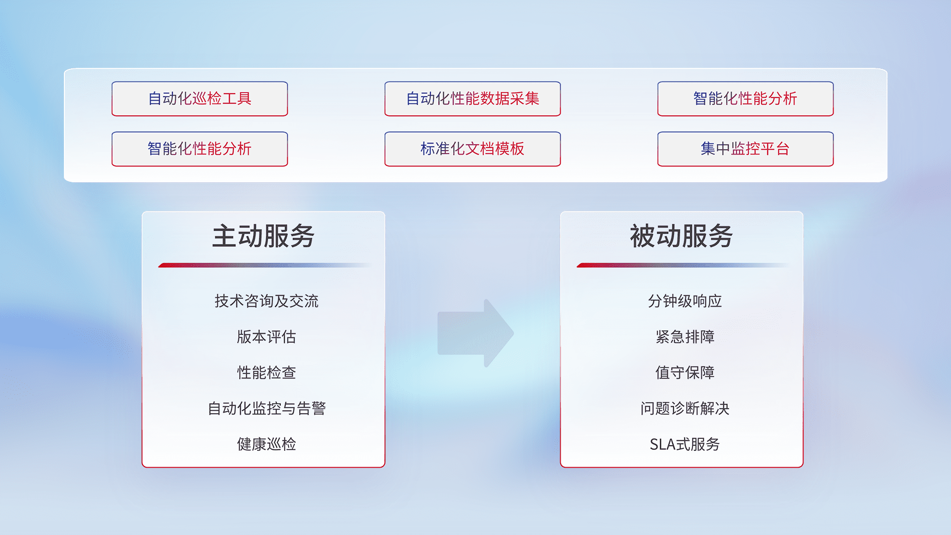 智能化工具和标准化文档,,,保障服务质量,,提供主动服务(包含技术咨询、、、版本评估、、性能检查、、、、自动化监控与告警、、、、健康巡检)和被动服务包含(分钟级响应、、、、紧急排障、、、、值守保障、、、问题诊断解决、、SLA服务)。。