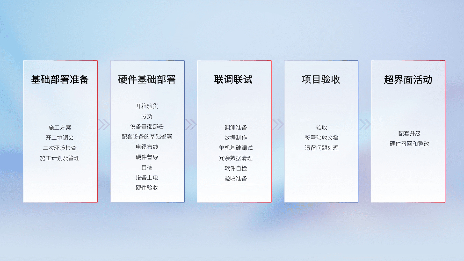 从基础部署准备、、硬件基础部署、、、、联调联试、、项目验收、、、越界面活动的全过程可追溯,,,,保证施工质量和进度。。。